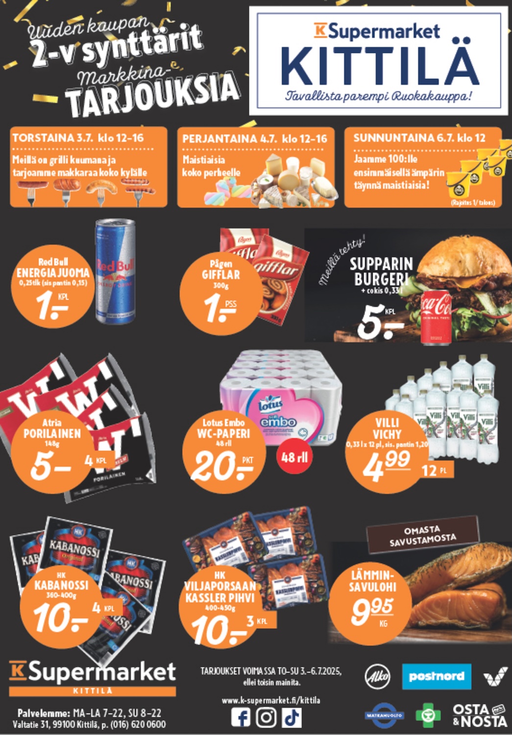 K-Supermarket Kittilä, S-Market and Tokmanni serving from morning till evening.