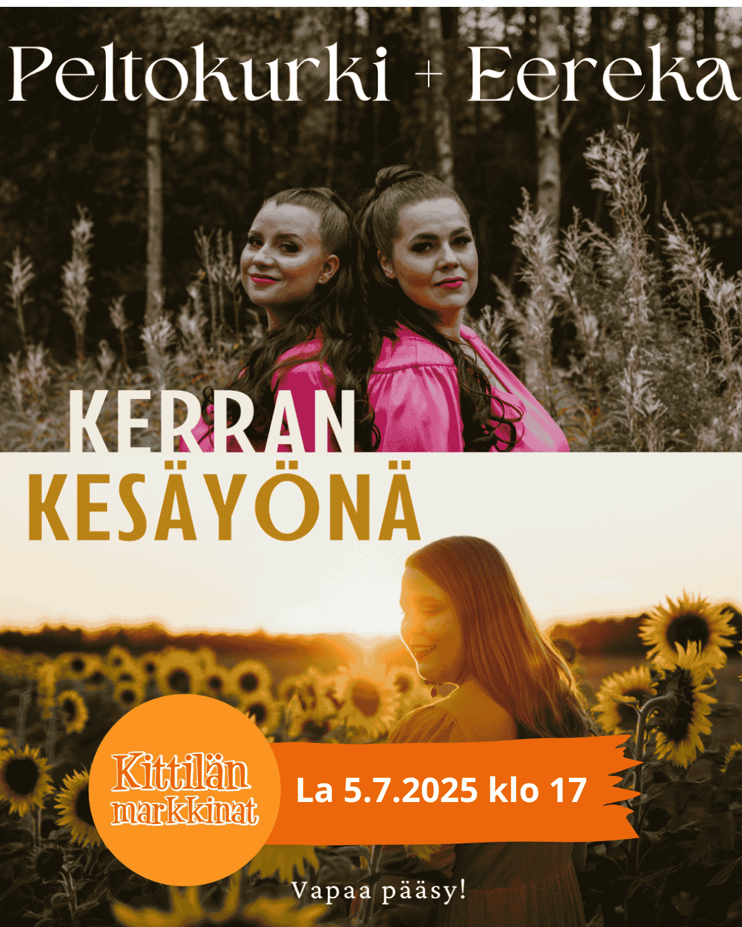 Peltokurki and Eereka will tour Finland together for the second time in the summer of 2025, combining the music of both bands. The joint tour combines summer, storytelling, poetry and the bright harmonies of the three singer-songwriters. The concerts will feature productions by both Peltokurki and Eereka with joint arrangements, as well as a few summer cover songs that tie the themes of the songs together. The tour’s concert venues will be idyllic and unique environments, where you can immerse yourself in the swinging summer tunes and delicate atmosphere.